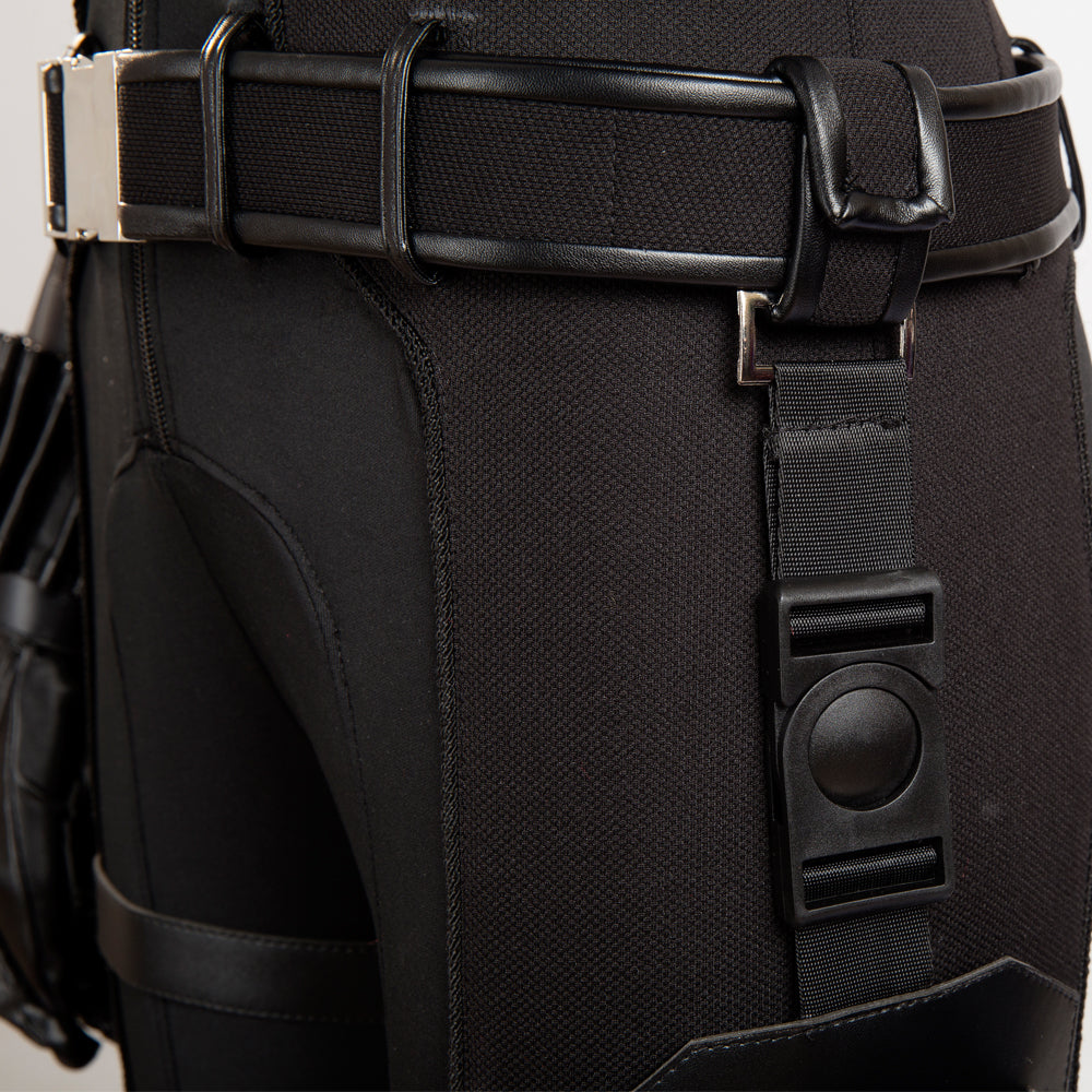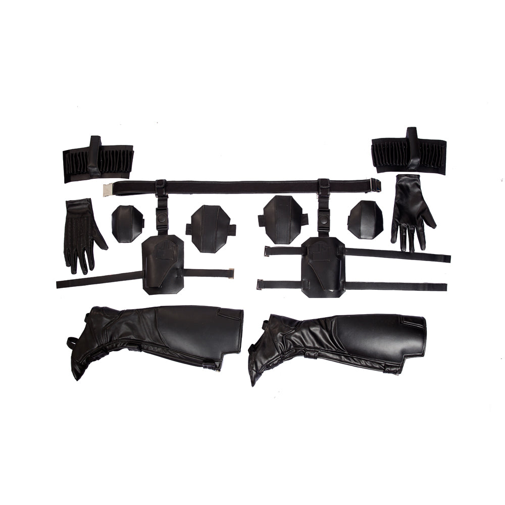 Includes:jumpsuit,belt,bandages,cuffs,knee pads,gloves,boot covers,holster